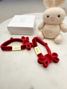 Bransoletka aksamitka czerwona elastyczna z imieniem dziecka lub własnym (może to być również inny tekst, max 8 słów) oraz dowolnym grawerem na odwrocie (data, dedykacja, cytat)