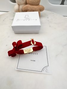 Bransoletka dla dziecka/mamy/taty z dowolnym grawerem obustronnym na wstążce z zawieszką przylegającą
