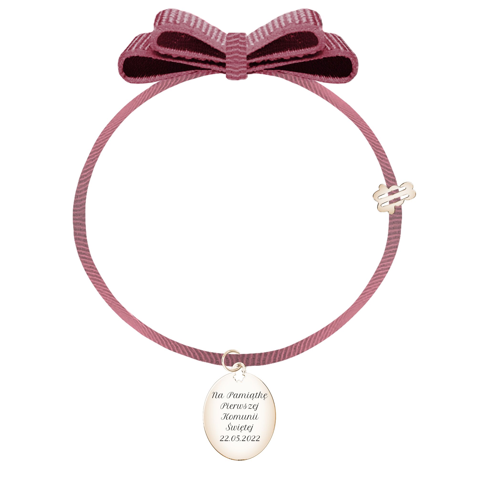 Bransoletka na Komunię wstążka z owalem z dowolnym grawerem z przodu i na odwrocie zawieszki z kokardką lub bez.