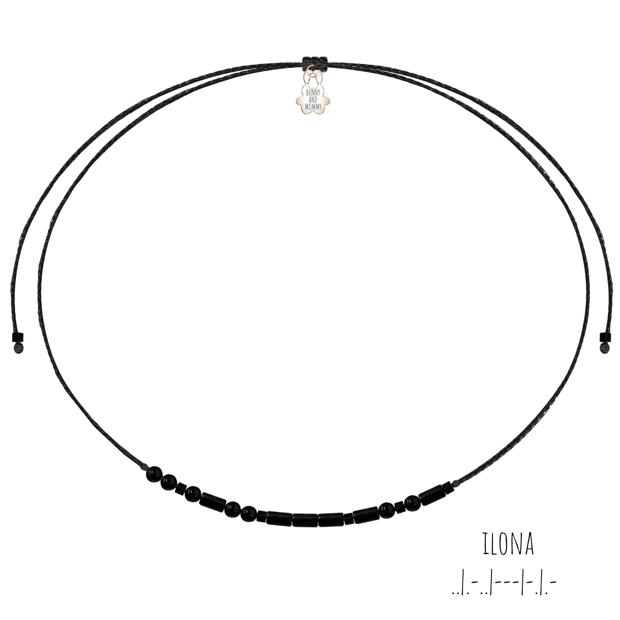 Bransoletka z kolekcji #WRITTEN IN STONES to wyjątkowy sposób subtelnego przekazania komuś wiadomości zaszyfrowanej alfabetem Morse’a. Bransoletka Black stone jest połączeniem naturalnego czarnego hematytu w trzech kształtach: okrągłym (symbolizującym kropki), podłużnym (symbolizującym kreski) i kostki (symbolizującej przerwę). Biżuteria daje możliwość zaszyfrowania dowolnego słowa, stanowiąc wyjątkowy i niepowtarzalny pomysł na prezent zarówno dla kobiety jak i mężczyzny. Bransoletka wykonana jest z czarnej wiecznej nici, w dowolnym rozmiarze z imiennikiem w wersji srebrnej i złotej. Kropka (kostka) jest końcem napisu.