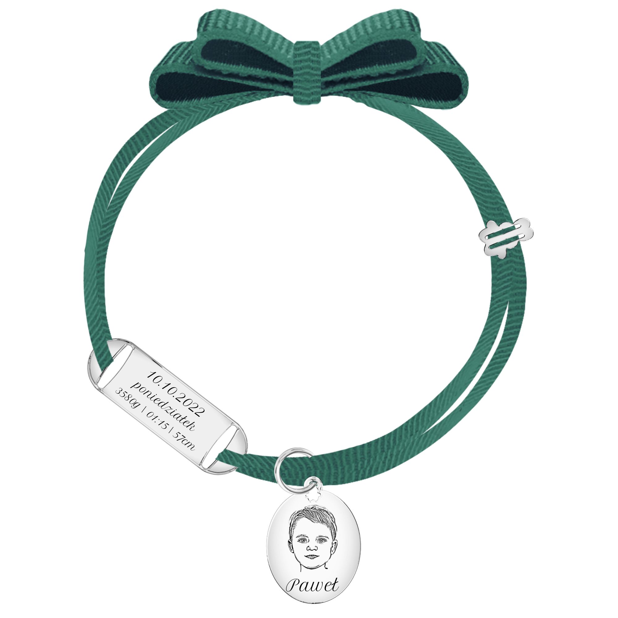 Bransoletka na wstążce przylegająca longy metryczką i wiszącym owalem z portretem ze zdjęcia i imieniem
