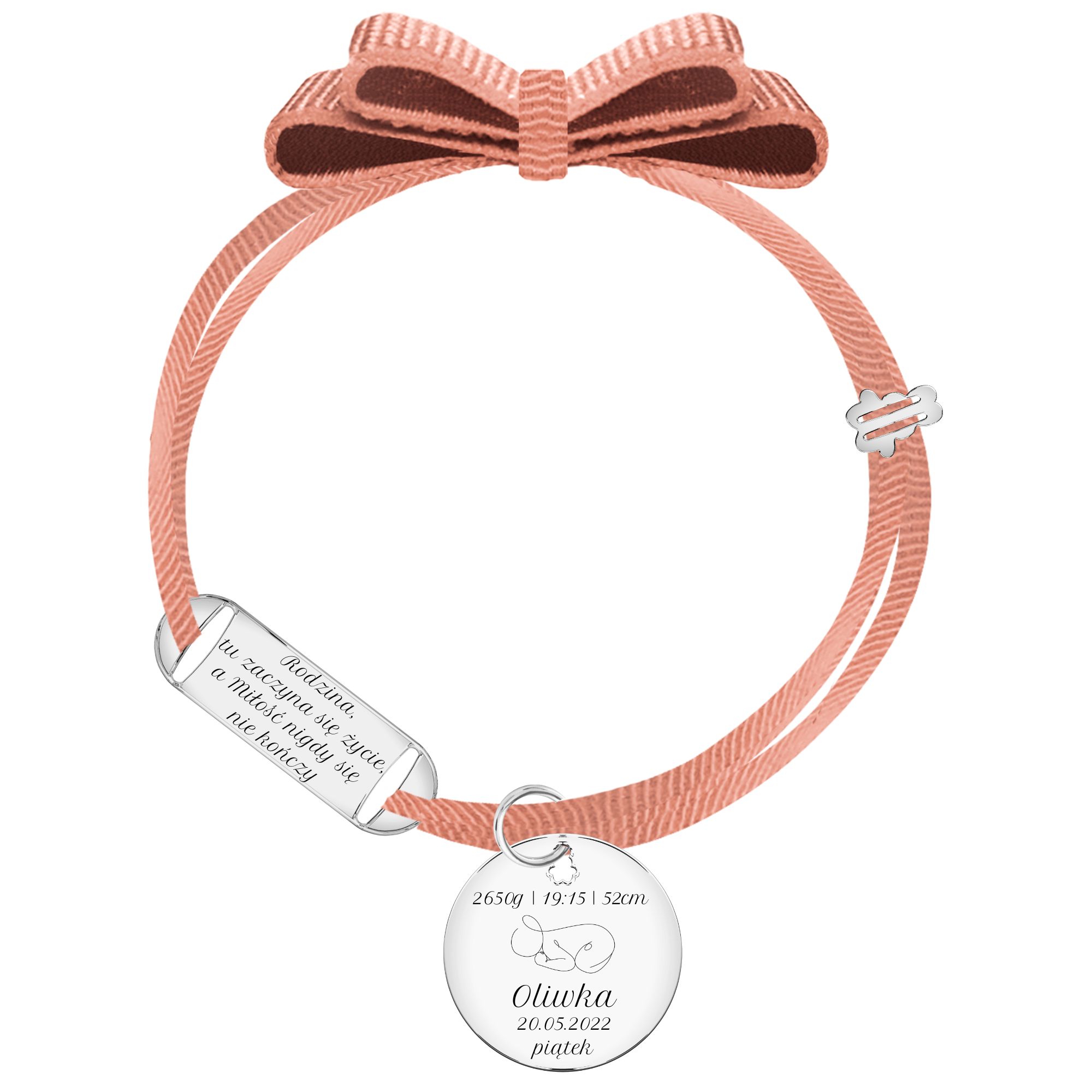 Bransoletka #METRYCZKA z wygrawerowanymi parametrami narodzin Twojego dziecka pozwala zamieścić imię, datę i godzinę narodzin oraz wagę i długość maleństwa idealnie skomponowane z grafiką bobasa techniką oneline oraz pięknym cytatem. Możliwość dodania dowolnego grawera na odwrocie zawieszki pozwala zamieścić dowolną sentencję lub dedykację. Bransoletka z metryczką stanowi wspaniałą i niepowtarzalną pamiątkę narodzin. Pełna personalizacja biżuterii pozwala dobrać odpowiedni rozmiar, kolor oraz wersję bransoletki. Bransoletka wykonana z elastycznej wstążeczki w dziewięciu wariantach kolorystycznych.