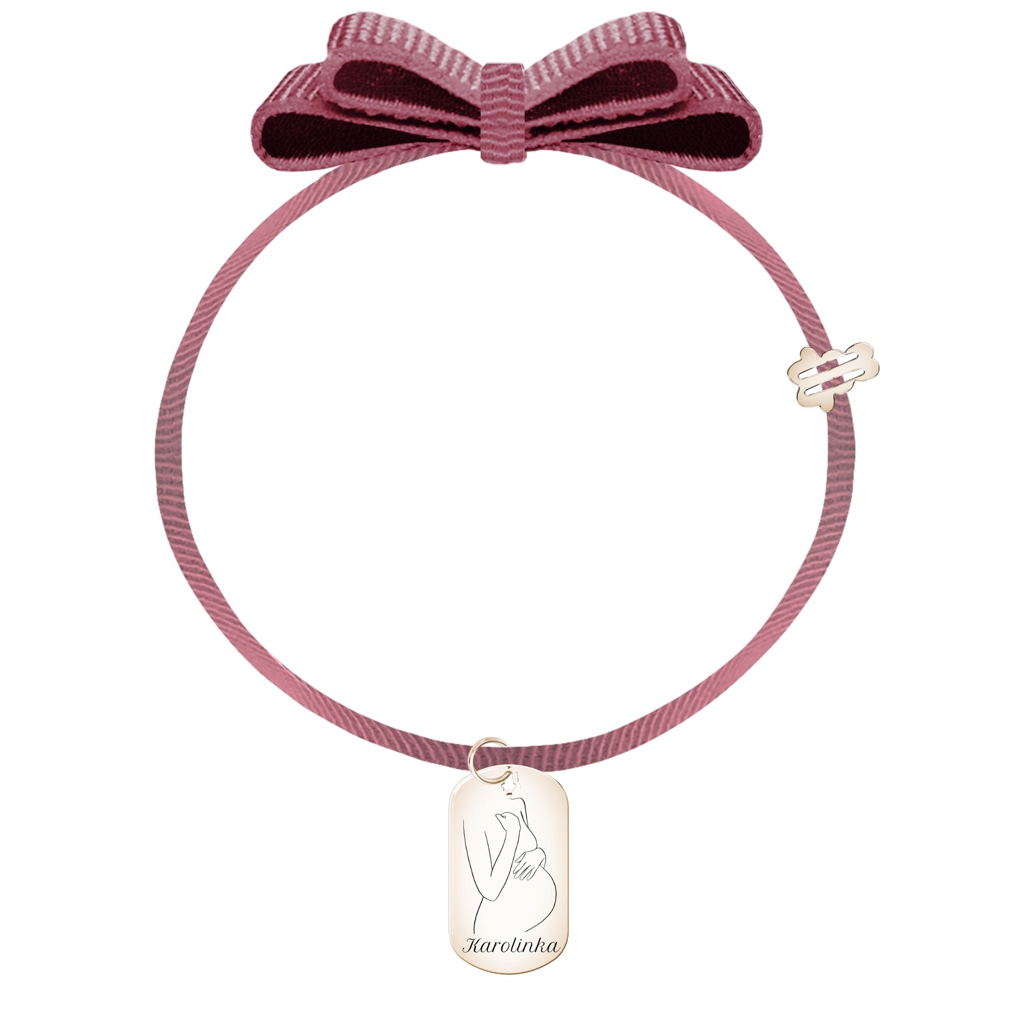 Bransoletka na wstążce z wiszącą zawieszką medalik z grafiką oneline mamy z brzuszkiem ciążowym i imieniem dziecka oraz dowolna sentencją na odwrocie