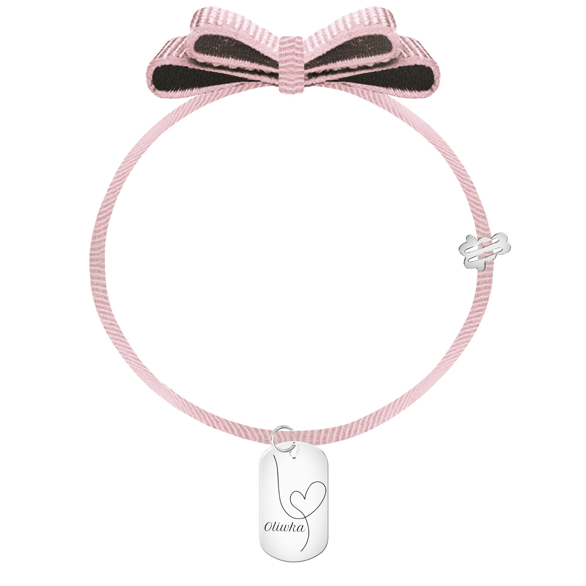 Bransoletka na wstążce z wiszącą zawieszką w kształcie medalika z grafiką oneline serca z imieniem oraz dowolnym grawerem na odwrocie