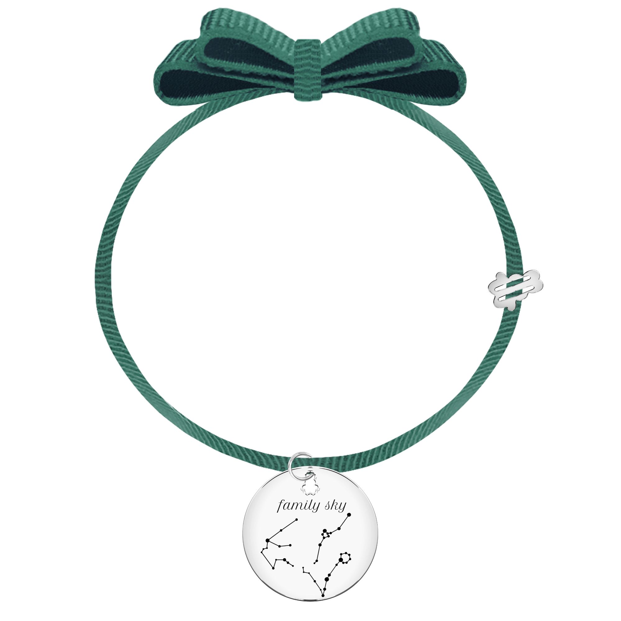 Bransoletka na wstążce z kolekcji #ZODIAKALNA z grafiką konstelacji gwiazd Twojego znaku zodiaku oraz bliskich Ci osób z sugerowaną sentencją family sky na przodzie zawieszki. Na odwrocie zawieszki wygrawerujemy dowolną sentencję. Bransoletka doskonale sprawdzi się jako prezent dla bliskiej Ci osoby lub stanie się Twoją piękną ozdobą, zawierającą symbol Waszych zodiaków.
