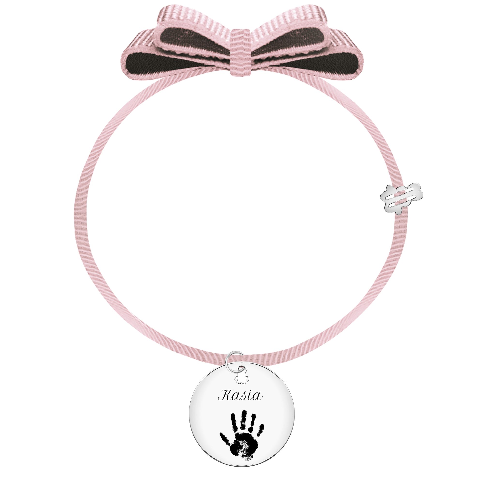 Bransoletka na wstążce z zawieszką kółko z symbolem odcisku dłoni z imieniem