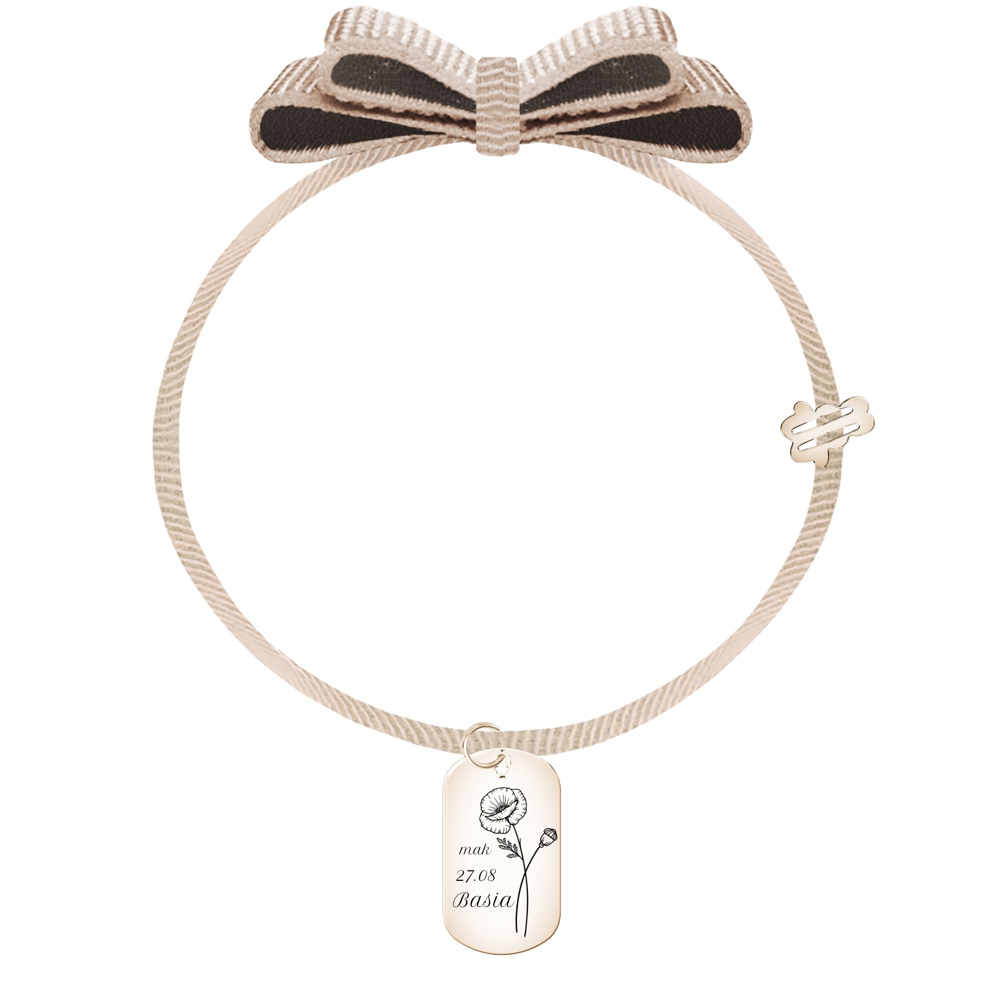 Bransoletka na wstążce z kolekcji #BIRTH FLOWER z grafiką kwiatu urodzeniowego (z nazwą kwiatu) z imieniem i datą urodzin na przodzie zawieszki. Na odwrocie zawieszki wygrawerujemy dowolną sentencję. Bransoletka doskonale sprawdzi się jako prezent dla bliskiej Ci osoby lub stanie się Twoją piękną ozdobą, zawierającą symbol Twojego miesiąca urodzin.