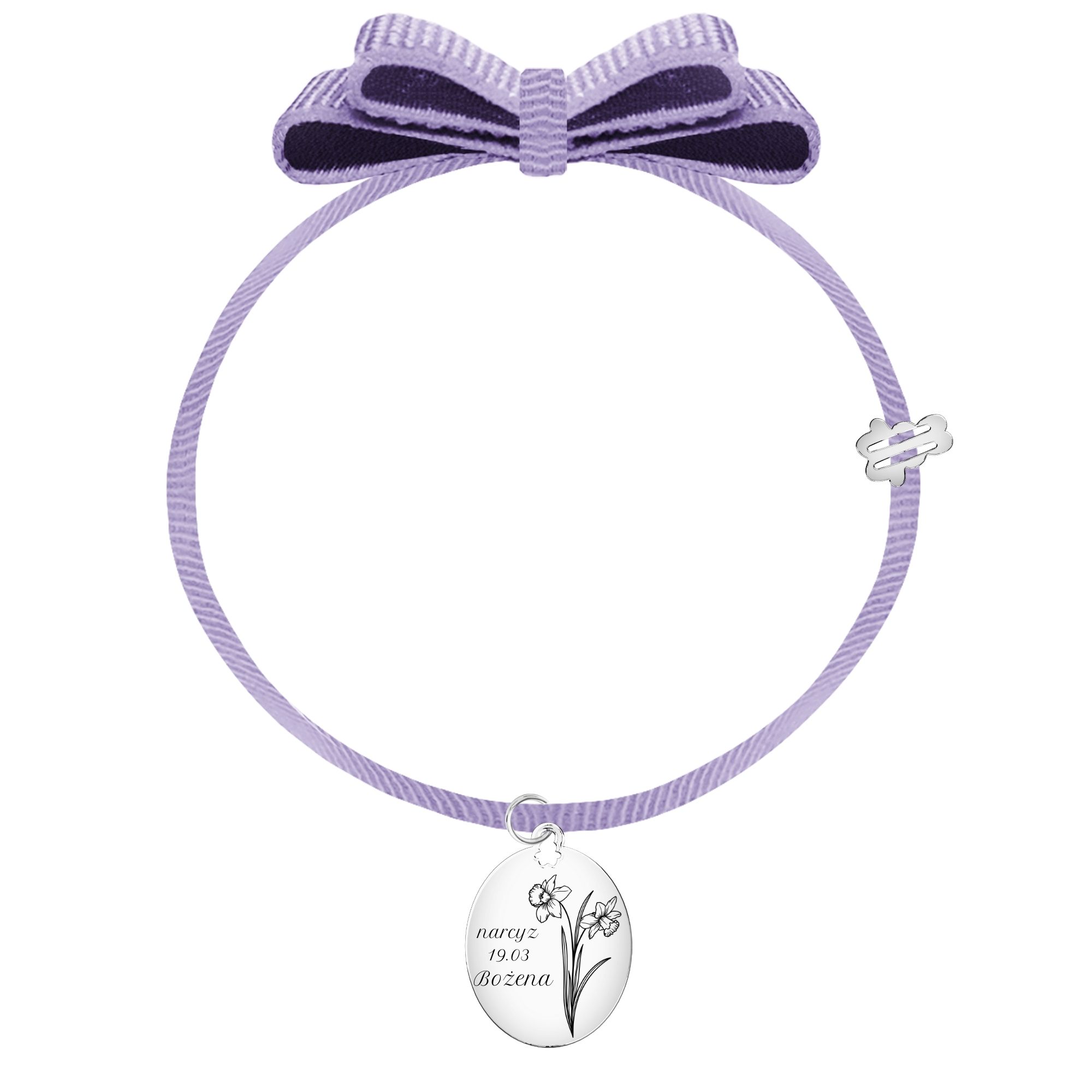 Bransoletka na wstążce z zawieszką owal z kwiatem urodzeniowym Twojego miesiąca z imieniem i datą