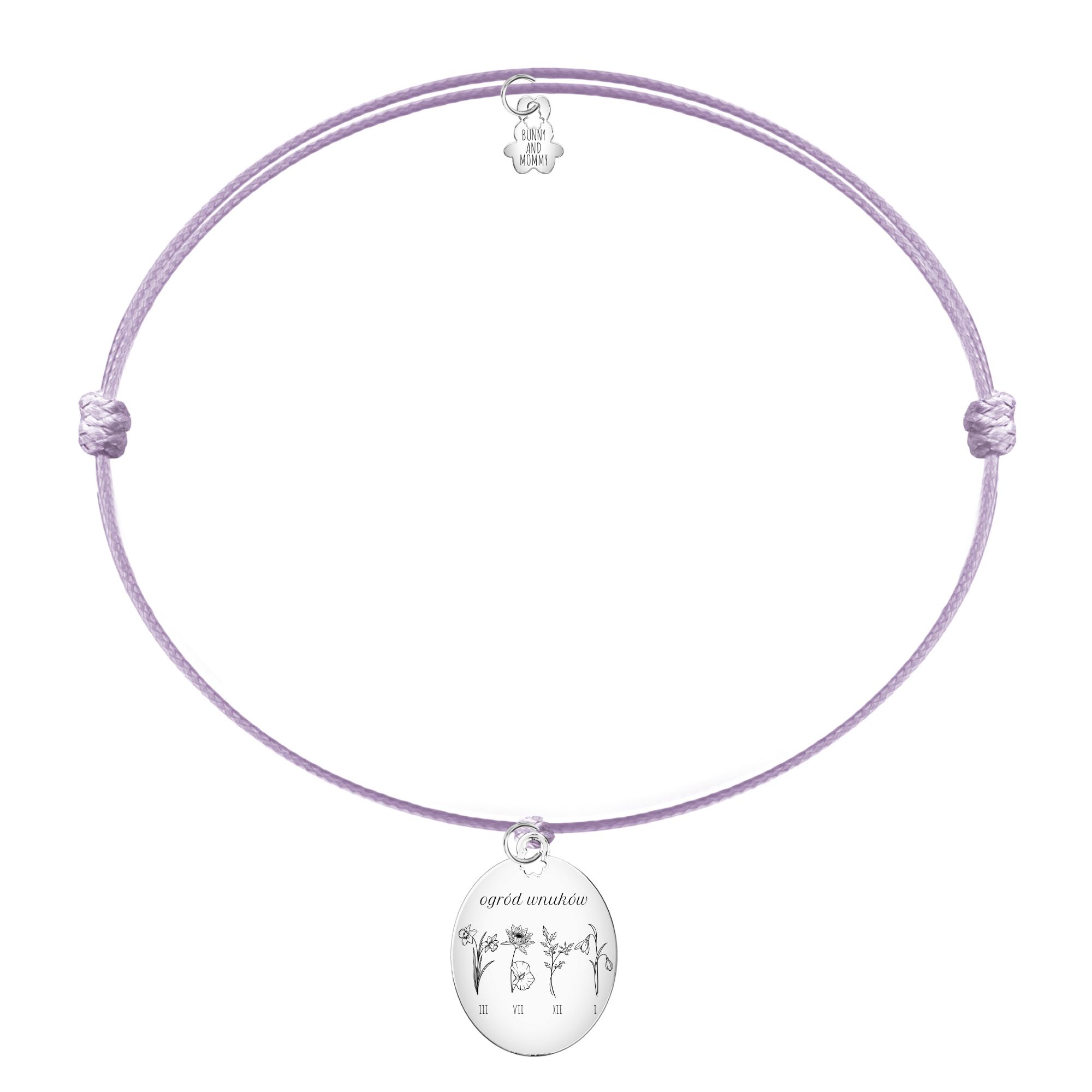 Bransoletka sznurkowa z kolekcji #BABCIA z grafiką kwiatów urodzeniowych wnuków. Na odwrocie wygrawerujemy dowolną sentencję. Bransoletka doskonale sprawdzi się jako prezent dla babci i stanie się Twoją piękną ozdobą, zawierającą symbol miesięcy urodzin jej wnuków.
