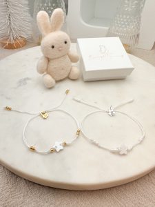 Bransoletka wykonana z wiecznej nici w kolorze białym z ozdobnymi koralikami w kolorze złotym. Bransoletka posiada regulację rozmiaru.